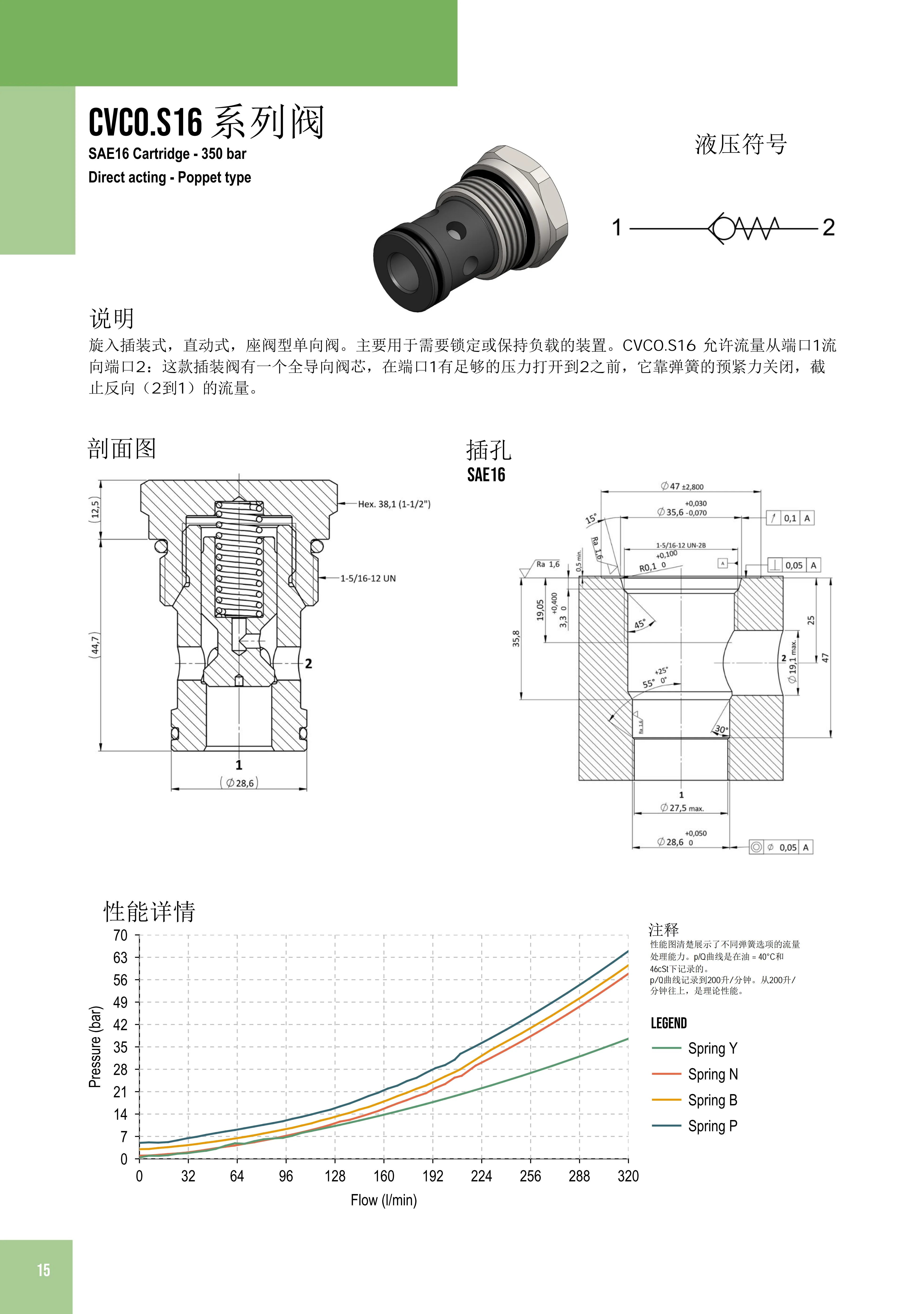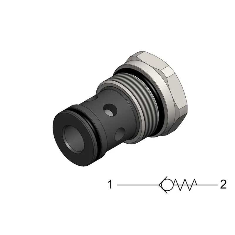 旋入插裝,直動式,座閥型單向閥。CVC0.S16 允許流量從端口1流向端口2:這款插裝閥有一個全導向閥芯,在端口1有足夠的壓力打開到2之前,它靠彈簧的預緊力關閉,截止反向(2到1)的流量。